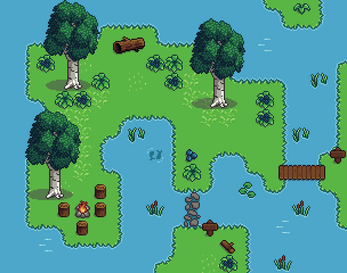 - Large objects: 6 trees, logs, wooden bridge, stepping stones, rocks, campfire, etc.